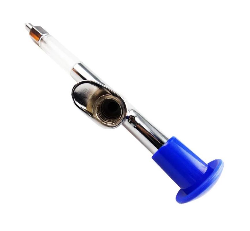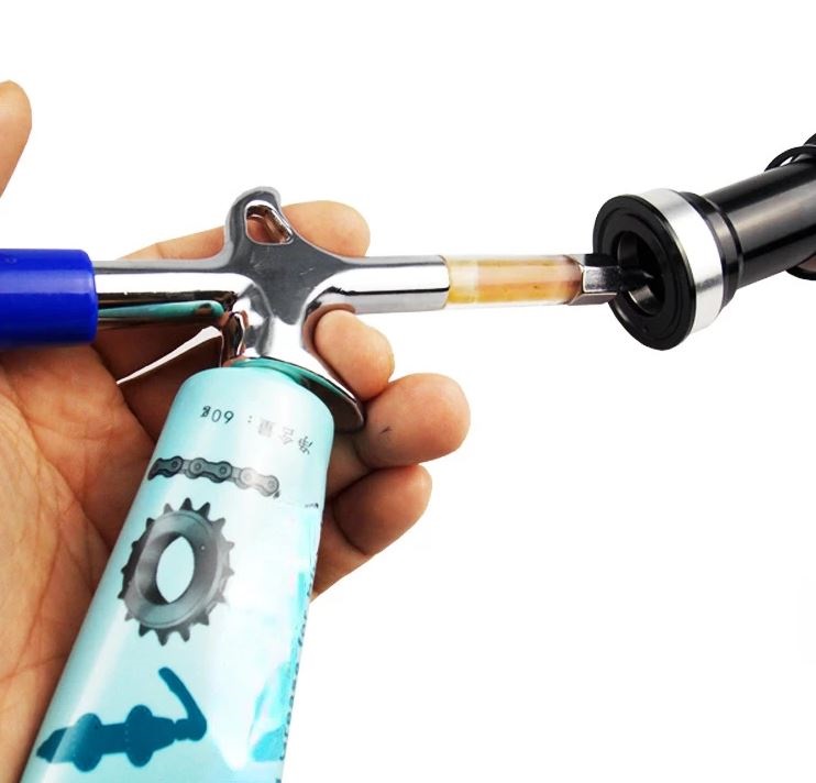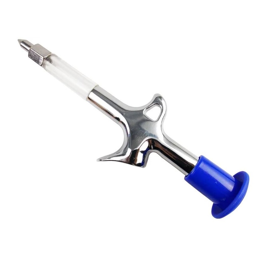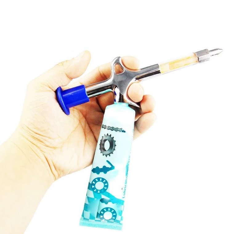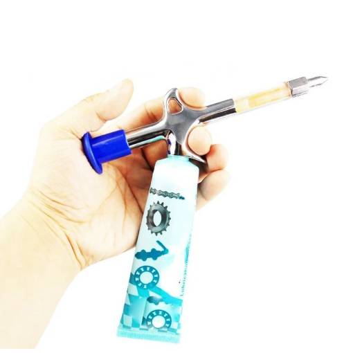 Conținutul acestuia se umple din nou prin apăsarea repetată a pistonului din plastic albastru în corpul uneltei, iar duza aplică pe locul dorit.