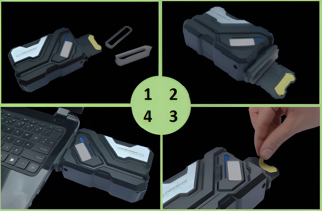 Săgețile roșii indică fluxul de aer cald care este expulzat de ventilator din laptop, în timp ce săgețile albastre indică direcția aerului răcoritor expulzat în exterior. Dispozitivul este fixat pe laptop utilizând siliconul, care îl fixează ferm la evacuarea de răcire.